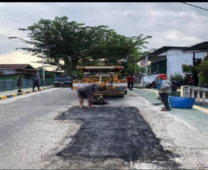 Tampak Para pekerja memperbaiki jalan yang berlubang di Kota Pekanbaru