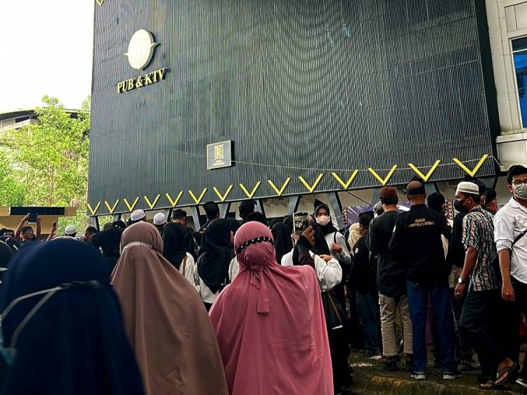 Ratusan masyarakat demo menyampaikan protes terhadap beroperasinya diskotek Joker Poker Pub & KTV di dekat masjid dan pesantren Jalan HR Soebrantas Panam.