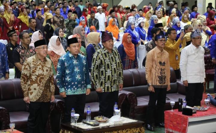 Bupati Siak Drs H Alfedri MSi dan Wakil Bupati Siak H Husni Merza BBA MM bersama Penasehat Gonjong Limo Riau Andi Rachman hadir pada pelantikan Gonjong Limo Kabupaten Siak di GOR Tualang.