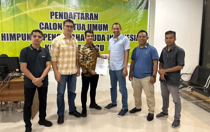 Ketua Karateker BPC HIPMI Kota Pekanbaru Welly Saputra terima formulir pendaftaran M Irvan Adelino ikuti pemilihan Ketum BPC HIPMI Kota Pekanbaru.