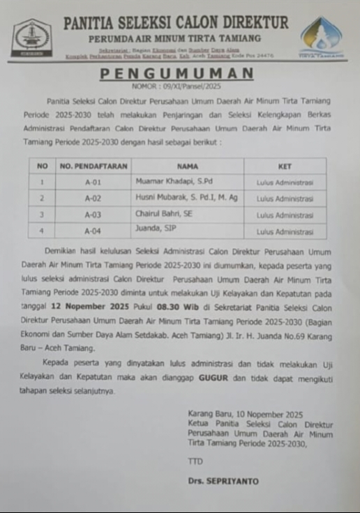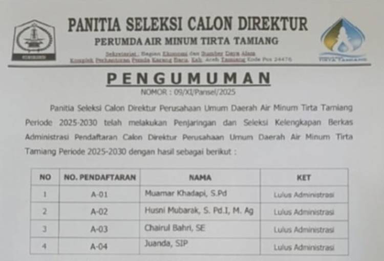 ACEH TAMIANG, datariau.com - Panitia Seleksi Calon Direktur Perusahaan Umum Daerah Air Minum (PERUMDA) Tirta Tamiang umumkan empat nama peserta lulus tahap seleksi administrasi periode 2025-2030, Senin (10/11/25).
