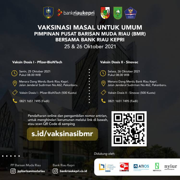 Jadwal kegiatan vaksinasi massal yang ditaja oleh Pimpinan Pusat Barisan Muda Riau (BMR) bersama Bank Riau Kepri