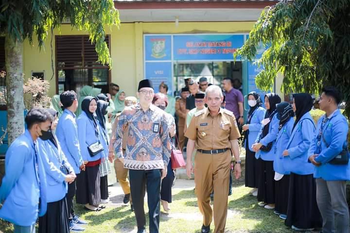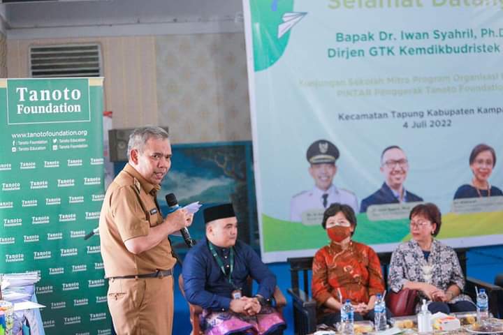 TAPUNG, datariau.com - Pj.Bupati Kampar Dr.H.Kamsol.MM didampingi beberapa kepala OPD dan Direktur Program Pendidikan Tanoto Foundation Ari Widowati dan staf, menghadiri acara Kunjungan Sekolah Mitra Program Organisasi Penggerak Pintar Penggerak Tanoto Foundation di Desa Pertapahan Jaya Kecamatan Tapung.(4/7/2022).