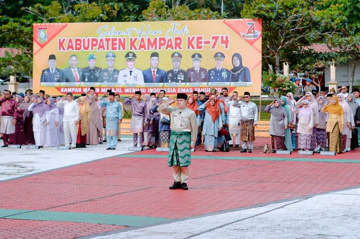 "Hari ini dengan tema “Kampar makin melaju, menuju Indonesia emas tahun 2045” semangat otonomi tersebut kembali kita maknai, salah satunya melalui upacara peringatan hari jadi Kabupaten Kampar, yang juga dilaksanakan pada 21 wilayah kecamatan di Kabupaten Kampar secara serentak pada hari ini,” lanjut Pj Bupati Kampar.