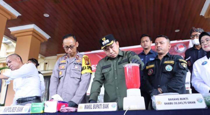 "Hari ini, kita bersama para undangan yang hadir melaksanakan pemusnahan barang bukti hasil tangkapan Satres Narkoba Polres dan Satpolair Polres Siak, ini merupakan bukti keseriusan kita dalam memeberantas peredaran narkoba khususnya di wilayah Kabupaten Siak," ujarnya.