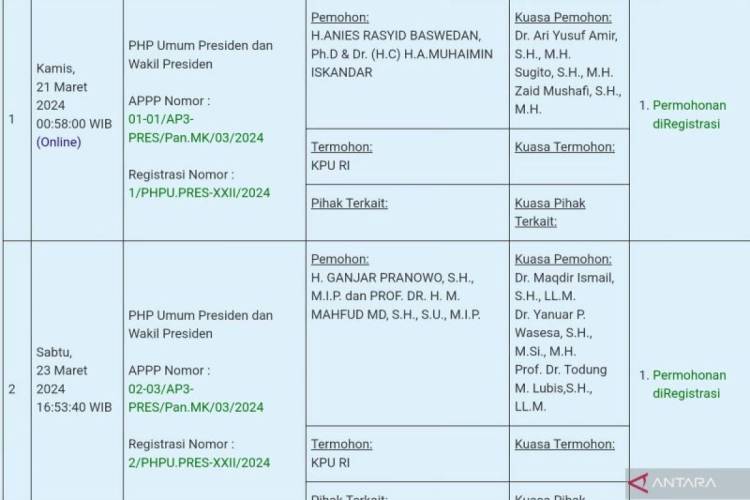 Tangkapan layar - Keterangan nomor registrasi permohonan perkara PHPU Pilpres yang diajukan oleh Anies-Muhaimin dan Ganjar-Mahfud dari laman resmi Mahkamah Konstitusi yang dipantau di Jakarta, Senin (25/3/2024).