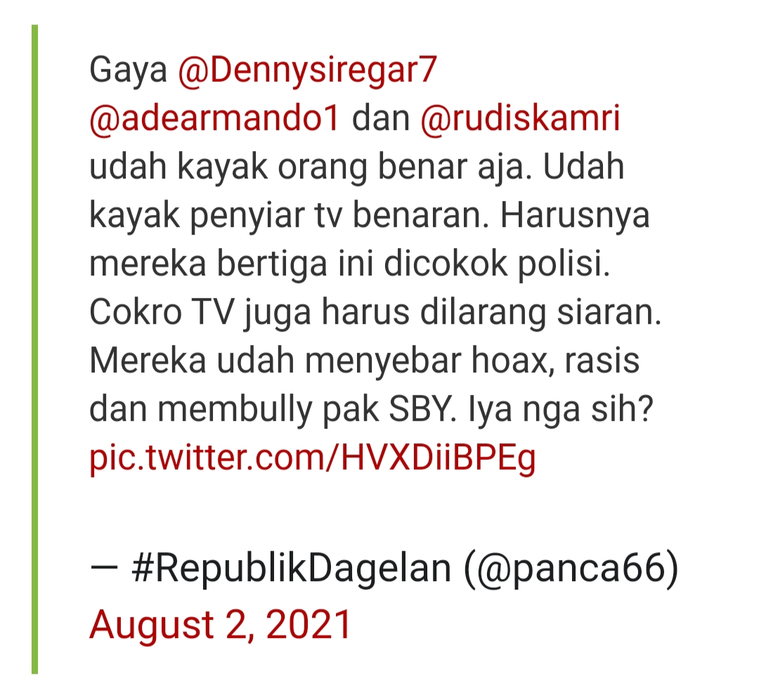 Politisi Demokrat Sebut Denny Siregar, Ade Armando Dkk Seharusnya Dicokok Polisi Serta Cokro TV Dilarang