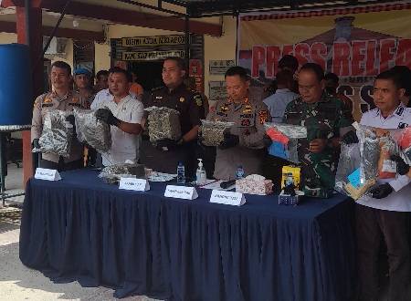Press release pemusnahan barang bukti narkotika jenis daun ganja kering di halaman Mapolsek Tualang.