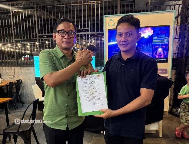 Ketua PSTI Kota Pekanbaru Aidhil Nur Putra saat memberikan dukungan secara resmi kepada Achmad Faisal Reza sebagai Ketua KONI Pekanbaru.