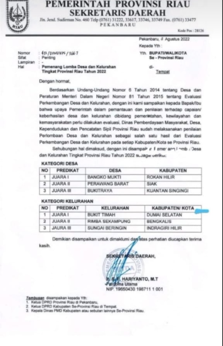 Dari hasil evaluasi, Pemprov Riau akhirnya memutuskan 3 desa dan kelurahan meraih predikat (juara) setelah dilakukan evaluasi pencapaian atau keberhasilan desa/kelurahan di bidang pemerintahan, kewilayahan dan kemasyarakatan, diantaranya;
