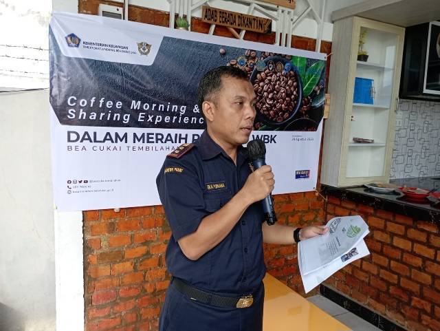 Foto kepala bea dan cukai tembilahan saat berbagi pengalaman dalam meraih WBK kepada para tamu undangan.