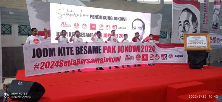 "Hari ini, di Pekanbaru, delapan relawan pendukung Jokowi yang terdiri dari RI Satu Jokowi, KOBAR, BaraJP, GK Jokowi, Bravo 5, Sedulur Jokowi, Posraya, dan Almisbat berkumpul dan bersatu untuk melaksanakan kegiatan silaturahmi, serta menegaskan komitmen bersama untuk 2024 setia bersama Jokowi, jom kita besame, satu komando bersama Jokowi," kata Arif Ekasaputra, Ketua Umum RI Satu Jokowi, di GOR Rumbai, Pekanbaru, Riau, dalam keterangannya, Jumat (25/3/2022).