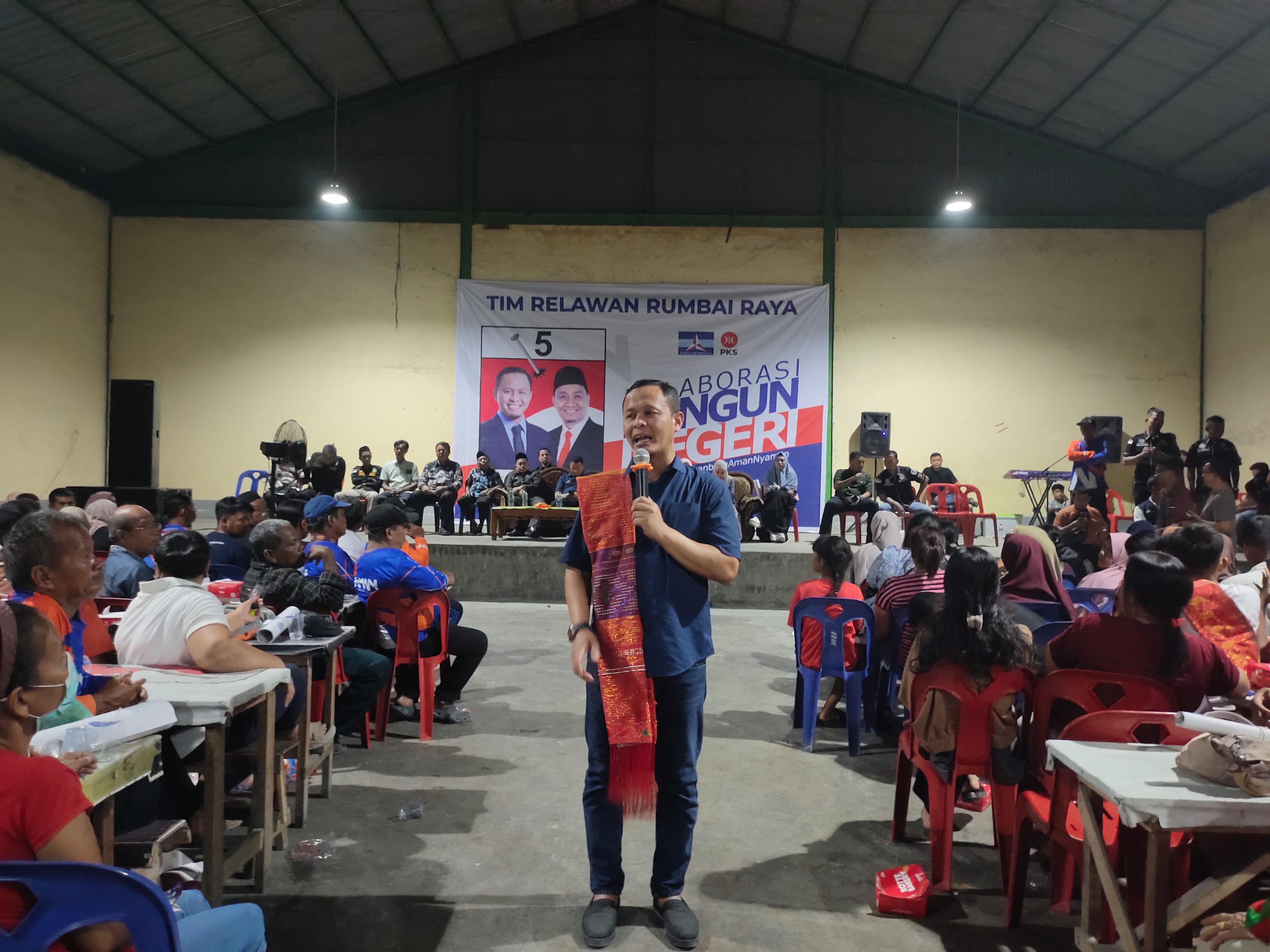 Ribuan Warga Palas Hadiri Kampanye Dialogis Agung Nugroho-Markarius Anwar di Gedung Sopo Godang, Palas, Rumbai, Senin (28/10/2024) malam.
