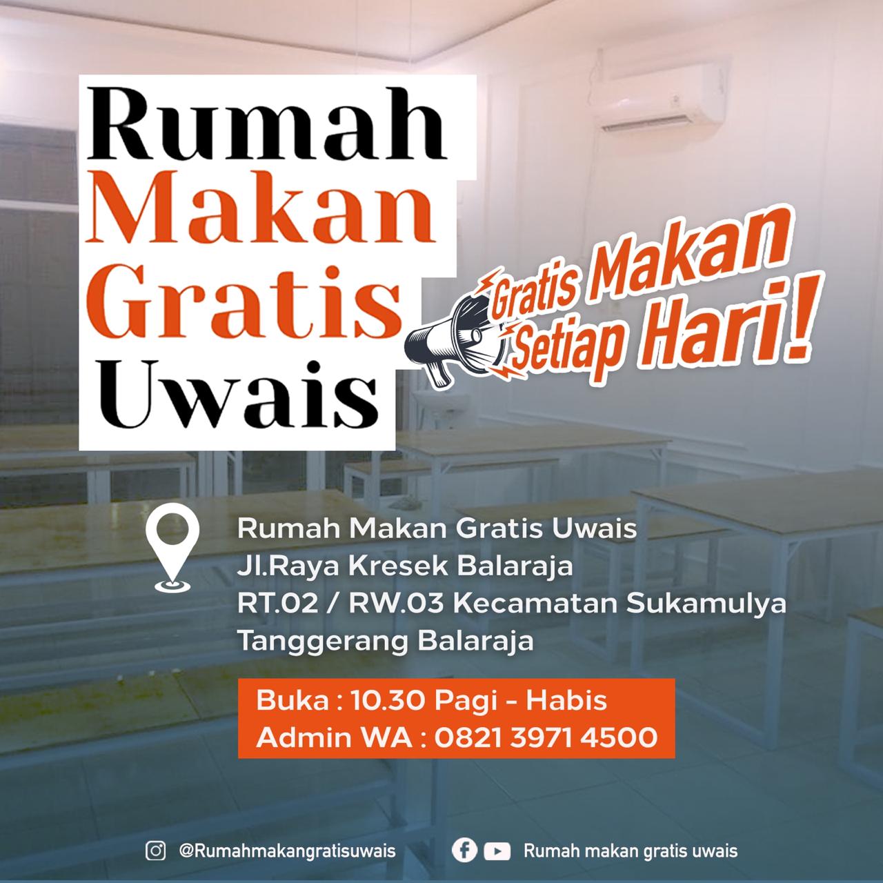Rumah Makan Gratis Uwais ini terletak di Jalan Raya Kresek Balaraja RT 02 RW 03 Kecamatan Sukamulya Tanggerang Balaraja, setiap hari buka dan menyediakan 400 porsi nasi serta lauk pauk lengkap dengan tempat makan yang nyaman, siapaun bisa makan di tempat itu. Pagi buka mulai pukul 10.30 Wib hingga habis, dan sore harinya pukul 16.00 Wib sampai habis.