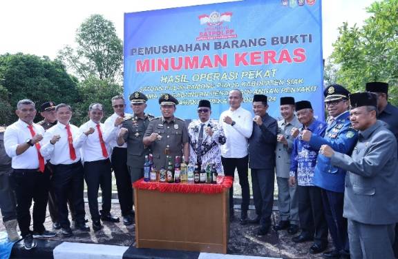 Pemusnahan barang bukti miras berbagai merk oleh Pemkab Siak dan Satpol PP Siak hasil operasi pekat beberapa waktu lalu.