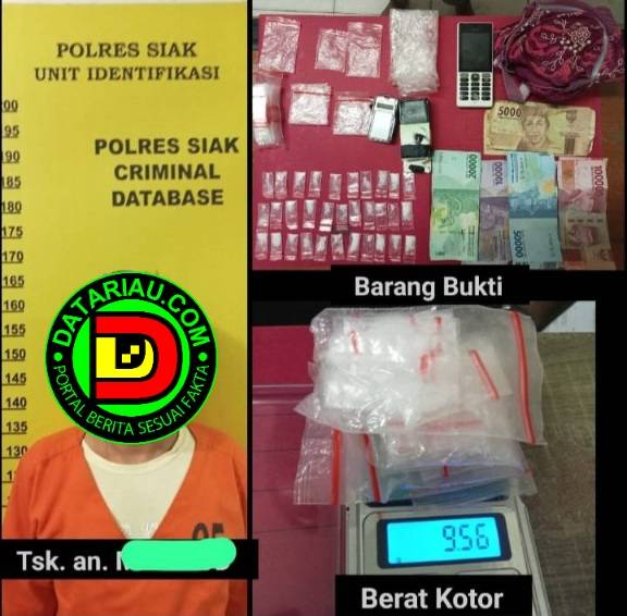 Pelaku inisial M (46) bersama barang bukti diduga narkotika jenis sabu-sabu diamankan Satres Narkoba Polres Siak.