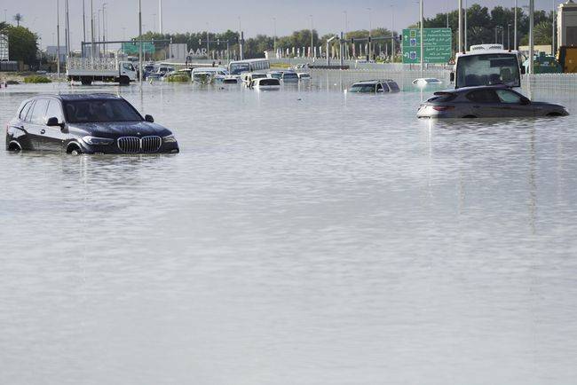 Pemandangan serupa terlihat di sekitar negara Teluk tersebut, termasuk di Sharjah, yang berbatasan dengan Dubai, di mana penduduknya mengarungi ruas jalanan utama dengan perahu darurat.