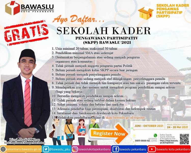 PEKANBARU, datariau.com - Badan Pengawas Pemilihan Umum (BAWASLU) Kota Pekanbaru, Bawaslu Republik Indonesia (RI) kembali membuka kesempatan bagi masyarakat yang ingin belajar tentang Pengawasan Pemilu dan pengetahuan kepemiluan melalui Sekolah Kader Pengawasan Partisipatif (SKPP) Tahun 2021.