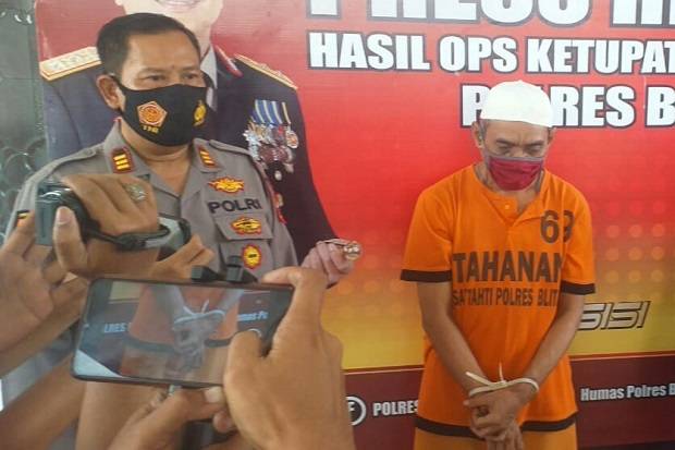 Tersangka pemerkosaan anak kandung usai diringkus anggota Polres Blitar. Foto/SINDOnews/Solichan Arif