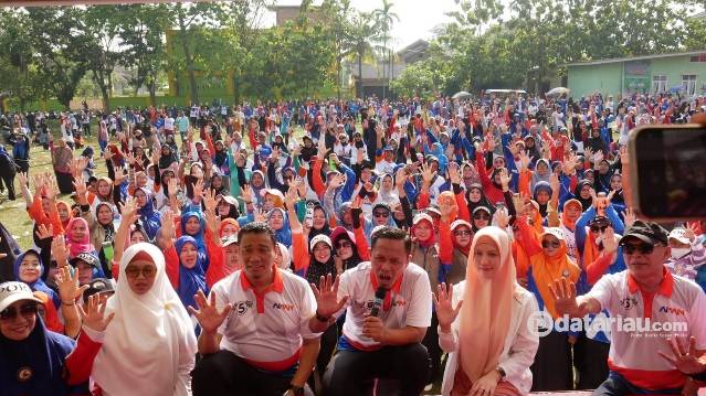 Paslon Walikota dan Wakil Walikota Pekanbaru Agung Nugroho-Markarius Anwar bersama ribuan masyarakat mengikuti Senam Sehat Pekanbaru AMAN di Lapangan Bola Kaki, Jalan Marsan Sejahtera, Ahad (3/11/2024).