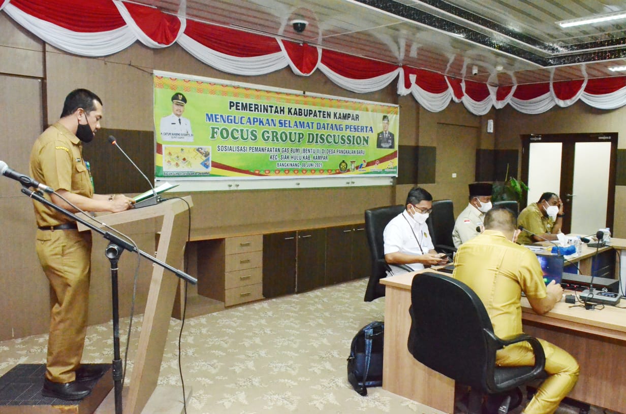 BANGKINANG KOTA, datariau.com - Sekretaris Daerah Kabupaten Kampar Drs Yusri MSi didampingi Asisten Ekonomi dan Pembangunan Setda Kampar Ir Suhermi membuka Focus Group Discussion (FGD) Sosialisasi Pemanfaatan Gas Bumi (Bentu II) di Desa Pangkalan Baru Kecamatan Siak Hulu, di ruang rapat lantai III Kantor Bupati Kampar, Selasa (8/6/2021).