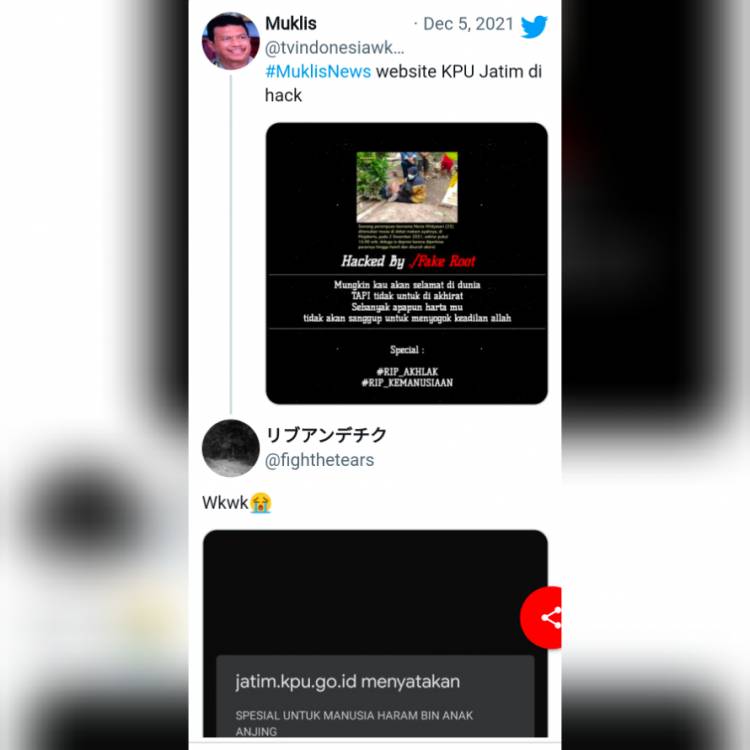 Sementara itu, warganet lain juga membagikan tangkapan layar website KPU Jatim yang berisi kalimat ?jatim.kpu.go.id menyatakan SPESIAL UNTUK MANUSIA HARAM BIN ANAK ANJ*NG?.