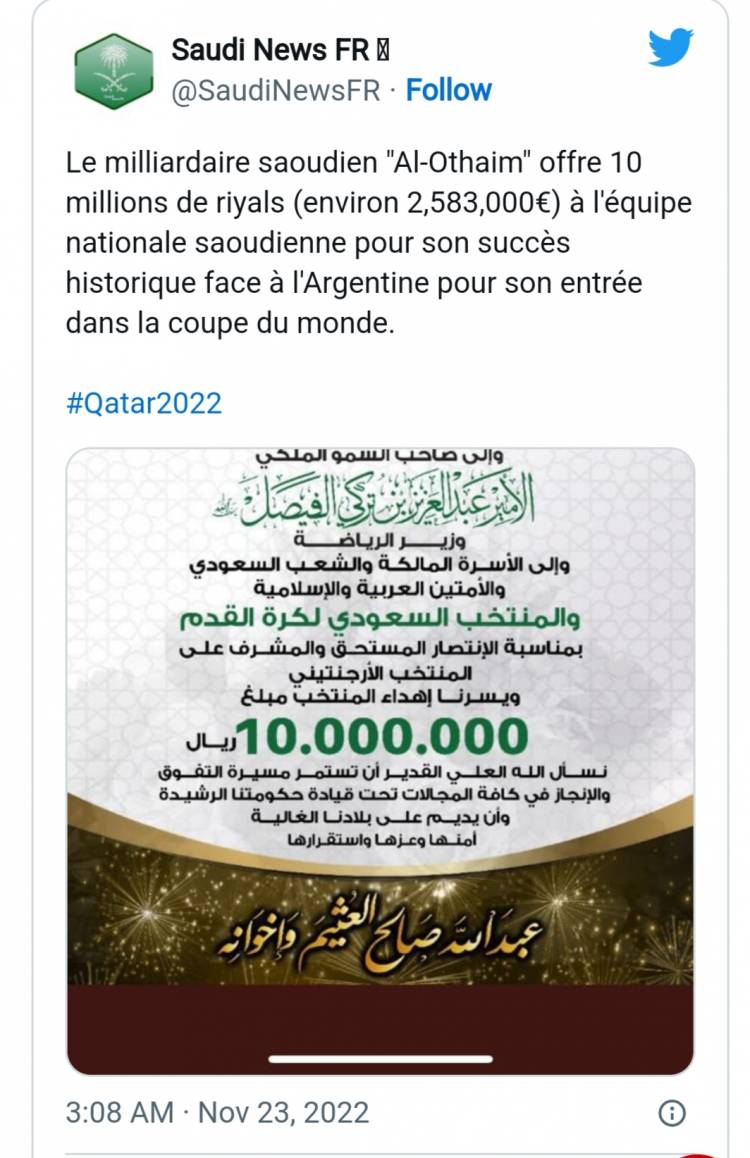 Skuad Arab Saudi Dapat Hadiah Rp41 Miliar dari Konglomerat
