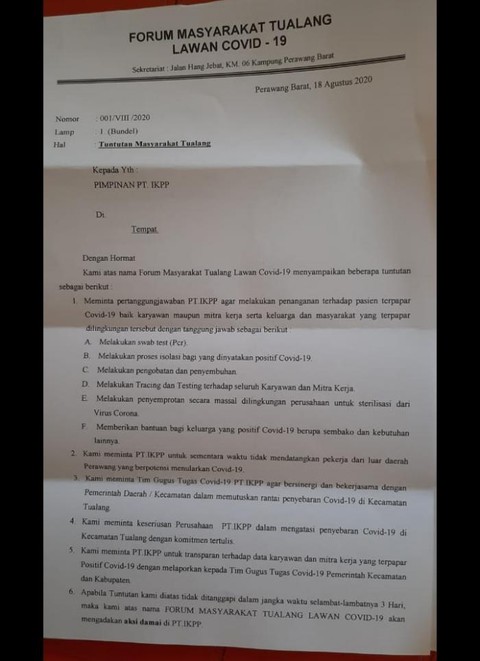 Surat Tuntutan Penting Forum Masyarakat Tualang Lawan Covid-19 Kepada PT IKPP Perawang