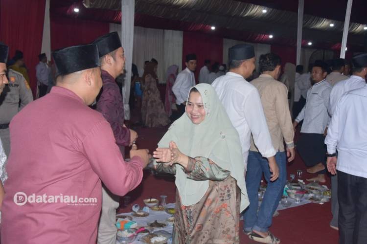Bupati Bengkalis Kasmarni saat menyambut para damu yang hadir dalam acara syukuran di kediaman pribadinya Desa Muara Basung Kecamatan Pinggir, Jum'at (1/3/2024).
