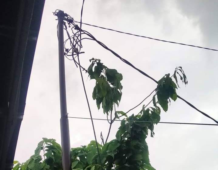 Salah satu tiang listrik besi yang mengalami kemiringan dan sering mengeluarkan percikan api ketika hujan dan petir.