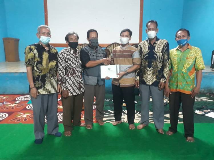 Ketua YP3S lama Iwan menyerahkan berkas administrasi kepada pengurus baru Teguh Wiyono disaksikan pembina dan anggota.