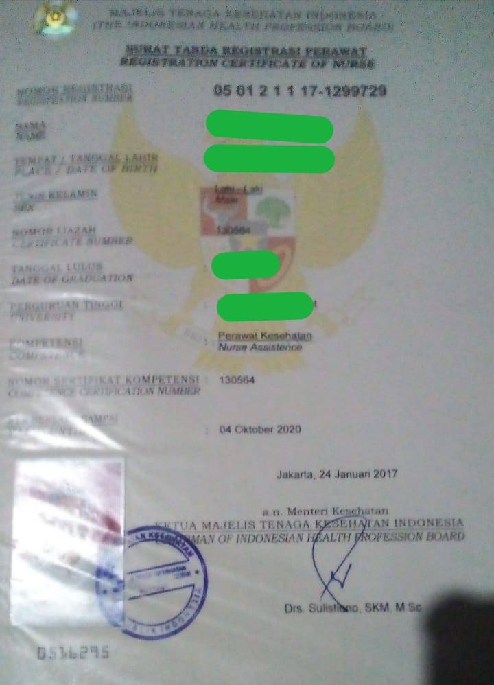 Surat Tanda Registrasi Perawat milik IK (46) terbit pada 2017 dan berakhir di 2020 lalu, dan saat ini menjalani profesi sebagai wartawan media online.