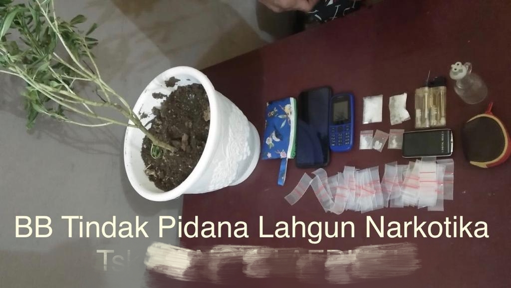 Dirasa ada yang janggal, selanjutnya tanah pada pot bunga tersebut dibongkar dan di dalamnya ditemukan 2 bungkus plastik sedang yang berisikan butiran kristal diduga narkotika jenis sabu, 3 bungkus plastik kecil yang berisikan butiran kristal diduga Narkotika jenis sabu-sabu, dan 1 sendok / scop yang terbuat dari pipet.