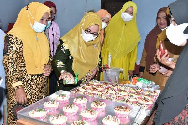 KUOK, datariau.com - Ketua Tim Penggerak Pemberdayaan Kesejahteraan Keluarga (TP PKK) Kabupaten Kampar Hj Muslimawati Catur didampingi Wakil Ketua I TP PKK Kampar Hj Juli Mastuti Yusri, Kepala Dinas DPPKBP3A Drs Edi Afrizal MSi, dan Kabid pemberdayaan perempuan Ismulyati, melakukan pelatihan pembuatan kue yang dilaksanakan di Kantor Camat Kuok, Senin (22/11/2021).