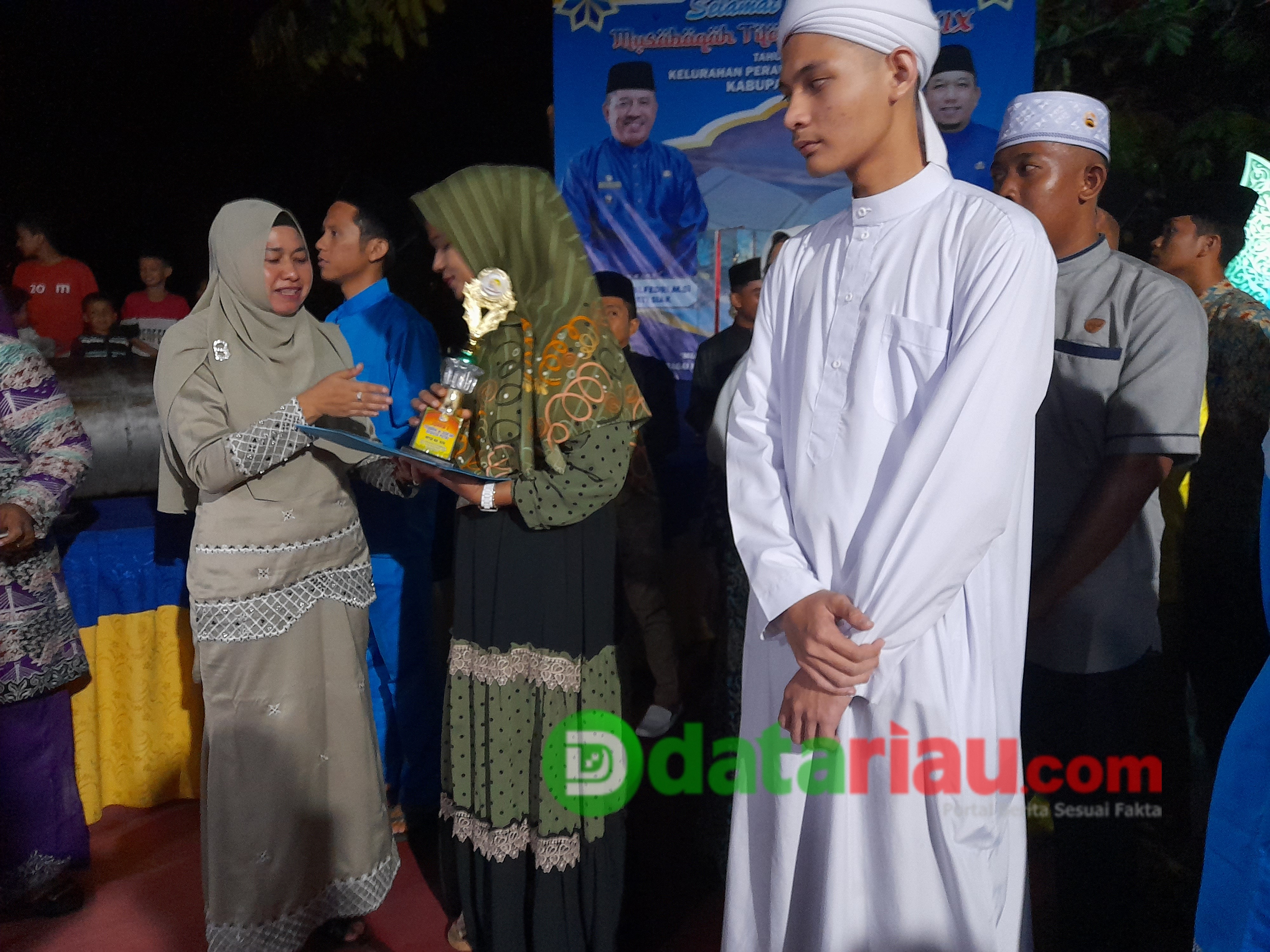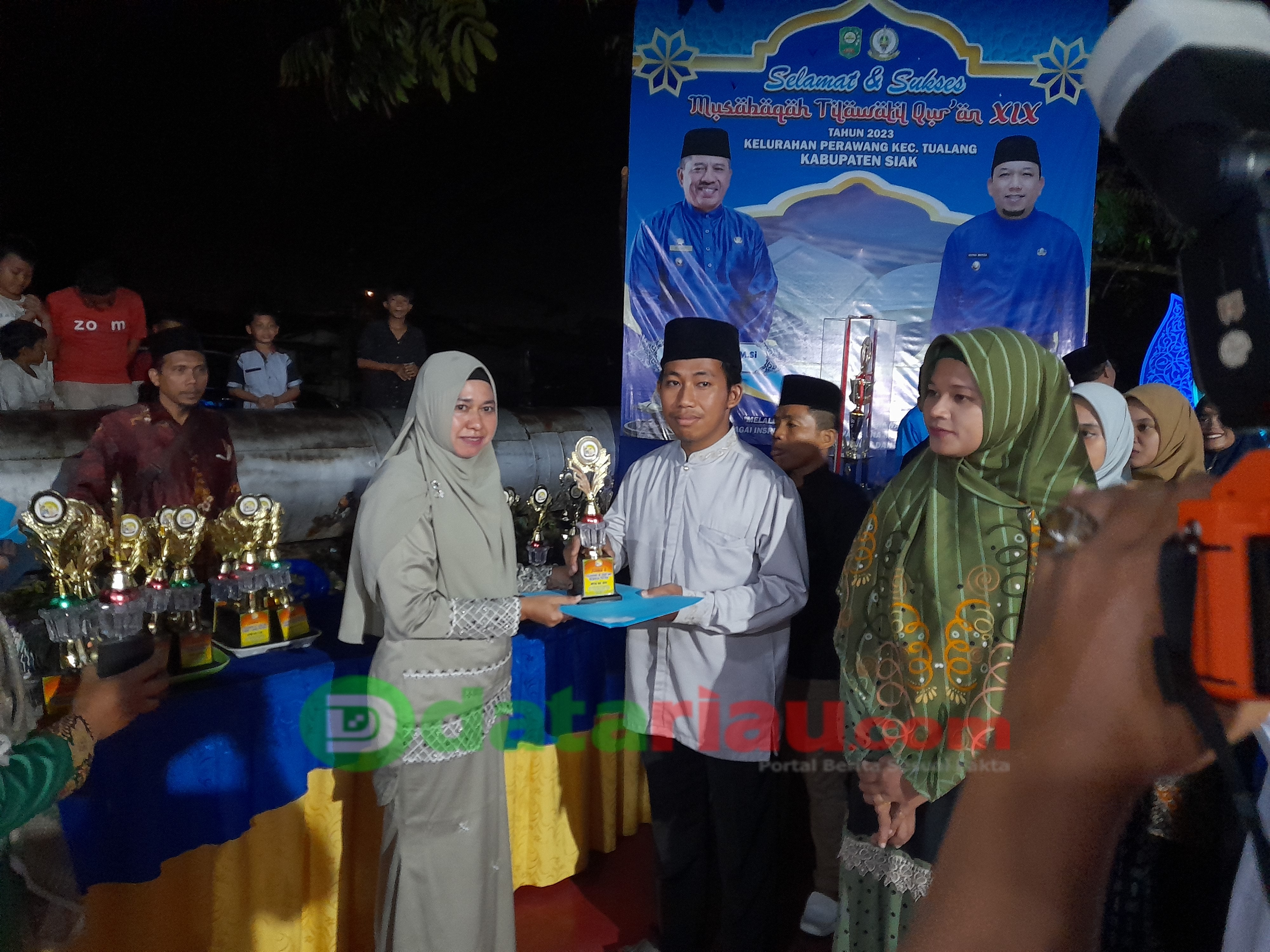 Lurah Perawang Midawati SSos serahkan piala Juara Umum MTQ ke-XIX Tingkat Kelurahan Perawang kepada Masjid Darul Aziz.
