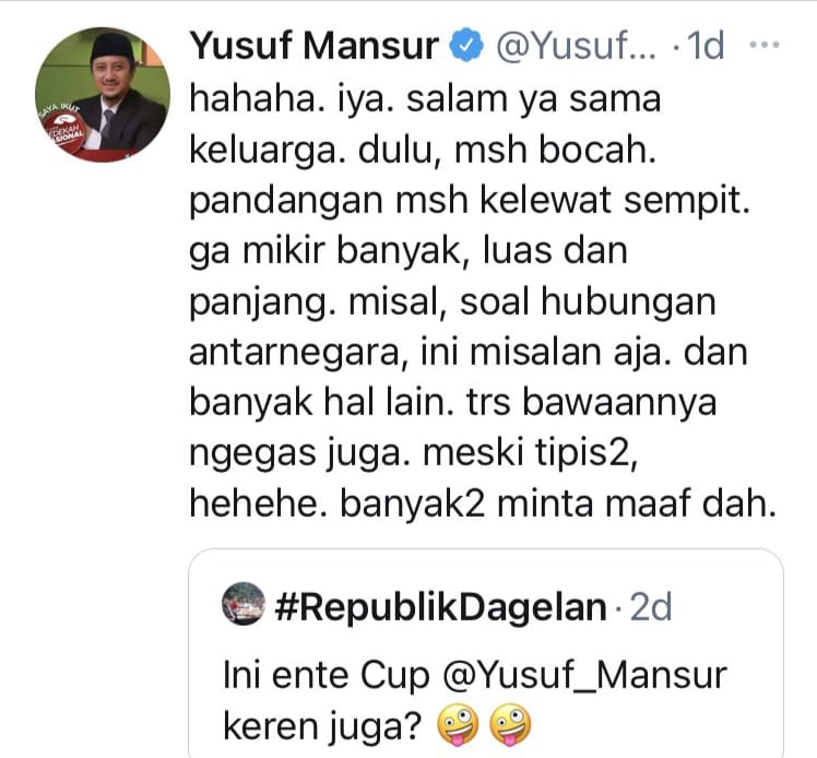 "Demen banget dialog sama kawan-kawan, meski saya ga kenal sama siapa saya jawab-jawab, hehehe. Seru aja. Kayak keluarga. Kayak temen lama. Sohib. Wis. Jangan ragu-ragu nyerang saya. Benar-benar jangan ragu-ragu. Semua saya jadikan bahan introspeksi juga kesaksian masa depan. Bismillaah. Feel free yaaa," kata UYM menambahkan.