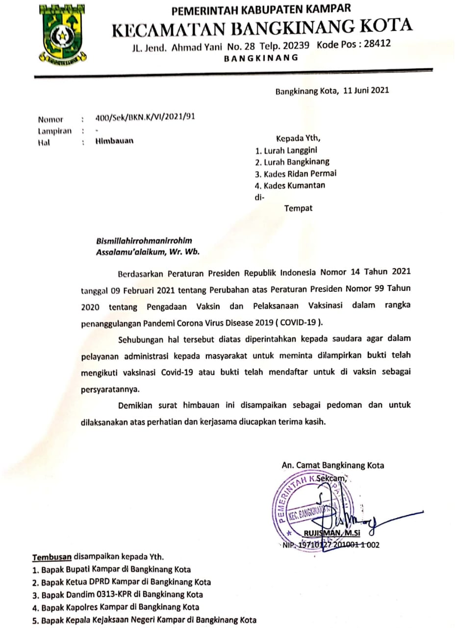 Warga Belum Vaksin Tidak Dilayani di Kantor Camat Bangkinang Kota