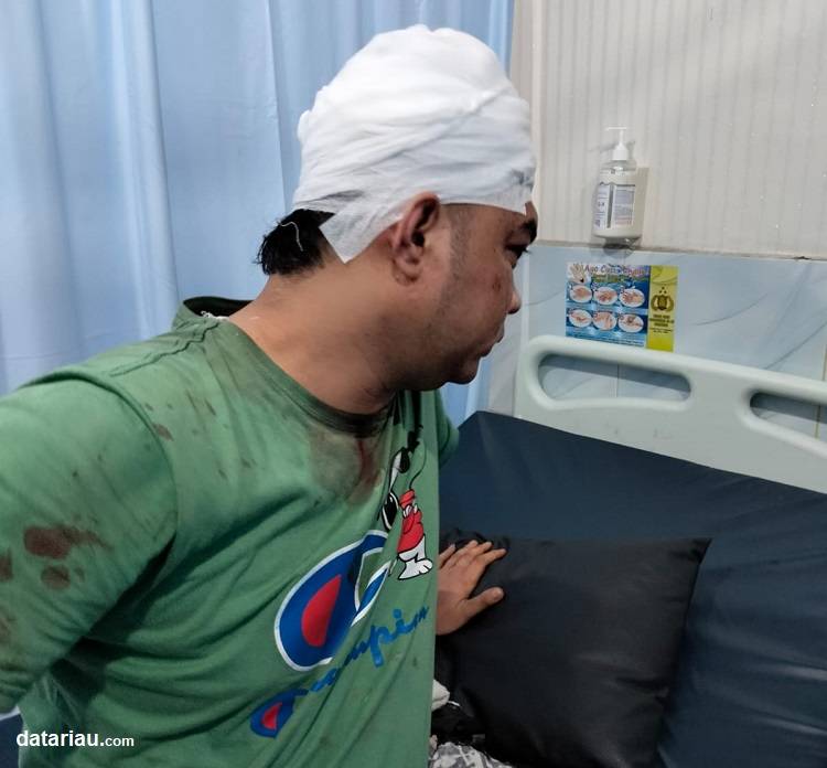 Kondisi Wartawan Media Online Riau yang juga Sekretaris KNPI, Miftahul Syamsir alias Uul saat mendapatkan tindakan medis usai dikeroyok sekelompok preman.
