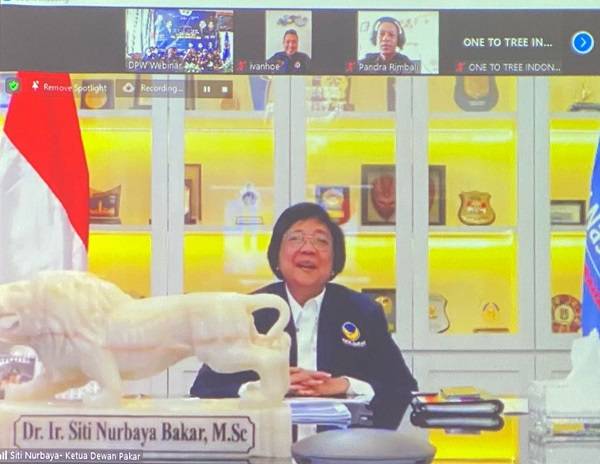 PEKANBARU, datariau.com - Menteri Lingkungan Hidup dan Kehutanan (LHK), Siti Nurbaya menjadi pembicara kehormatan dalam Webinar bersama Garda Pemuda NasDem Riau, Garda Pemuda NaDem se-Riau dan para Kader Partai NasDem, Sabtu (19/3/2022).