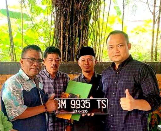 Zaidir Albaiza saat menyerahkan surat pernyataan pengunduran diri sekaligus menyerahkan secara simbolis ambulan.