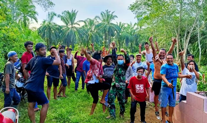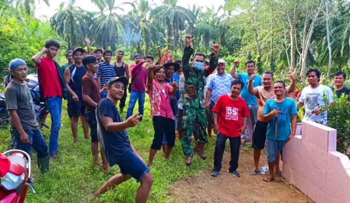 Terilihat, para pemuda, orang tua bersama Babinsa dan Bhaminkabtibmas Polsek Rambah melaksanakan sesi photo bersama setelah selesai melaksanakan kegiatan gotong royong pembersihan TPU.