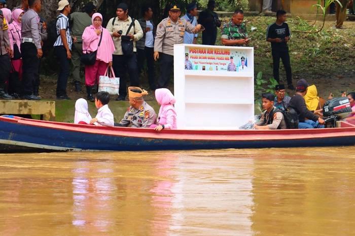 Setelah meresmikan pustaka air, Kapolres mengajak anak-anak setempat untuk menyisiri sungai Batang Gansal menggunakan sampan motor atau boat yang dijadikan pustaka air agar anak-anak bisa merasakan manfaat pustaka air keliling tersebut.