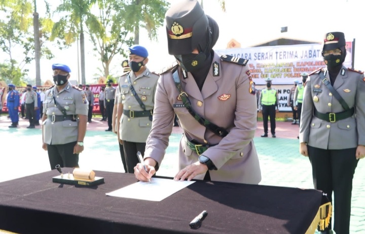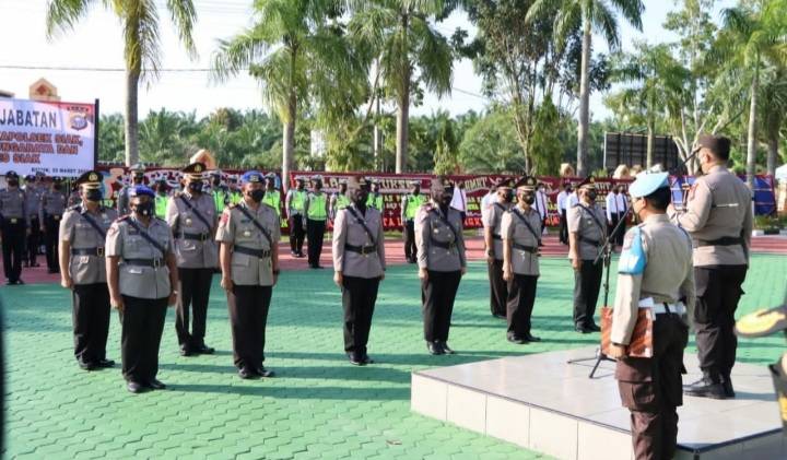 Kapolres Siak, AKBP Gunar Rahadiyanto, S.I.K,. M.H pimpin upacara sertijab Kasat dan Kapolsek jajaran Polres Siak dihalaman Mapolres Siak.