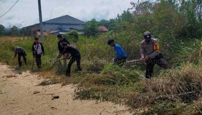 Bhabinkamtibmas Desa Maredan, Aipda Gelora Hutasoit kerja bakti bersama pemuda Maredan.