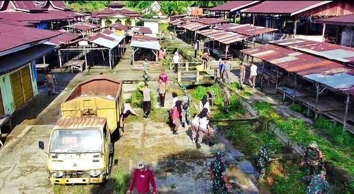 Antisipasi Banjir, TNI Polri dan Masyarakat di Rohul Gotong Royong Bersihkan Drainase Pasar