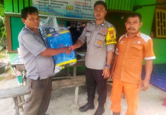 Bhabinkamtibmas Aiptu Gelora Hutasoit Serahkan Alat Semprot Hama dan Obat Kepada Petani