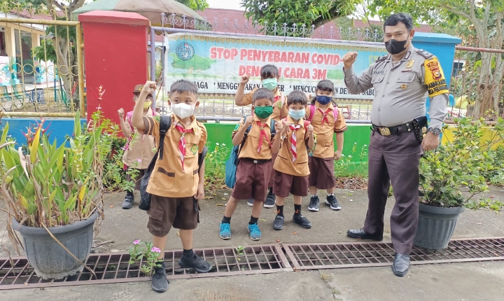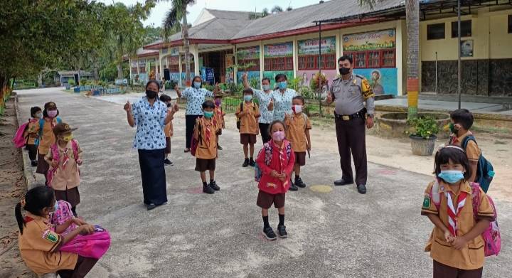 Bhabinkamtibmas Kampung Perawang Barat Aiptu Khairul tinjau kesiapan protokol kesehatan di SD Marsudirini.
