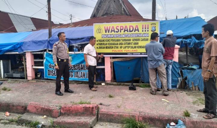Personil Bhabinkamtibmas Polsek Tualang pasang spanduk imbauan cegah terjadinya aksi curanmor di lokasi keramaian.
