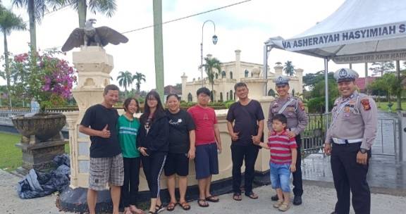 Satlantas Polres Siak sambangi para pengunjung tempat wisata di Siak Sri Indrapura.