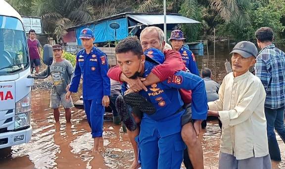 Cooling System Jelang Pemilu, Kasat Polairud Polres Siak Evakuasi Lansia Terdampak Banjir